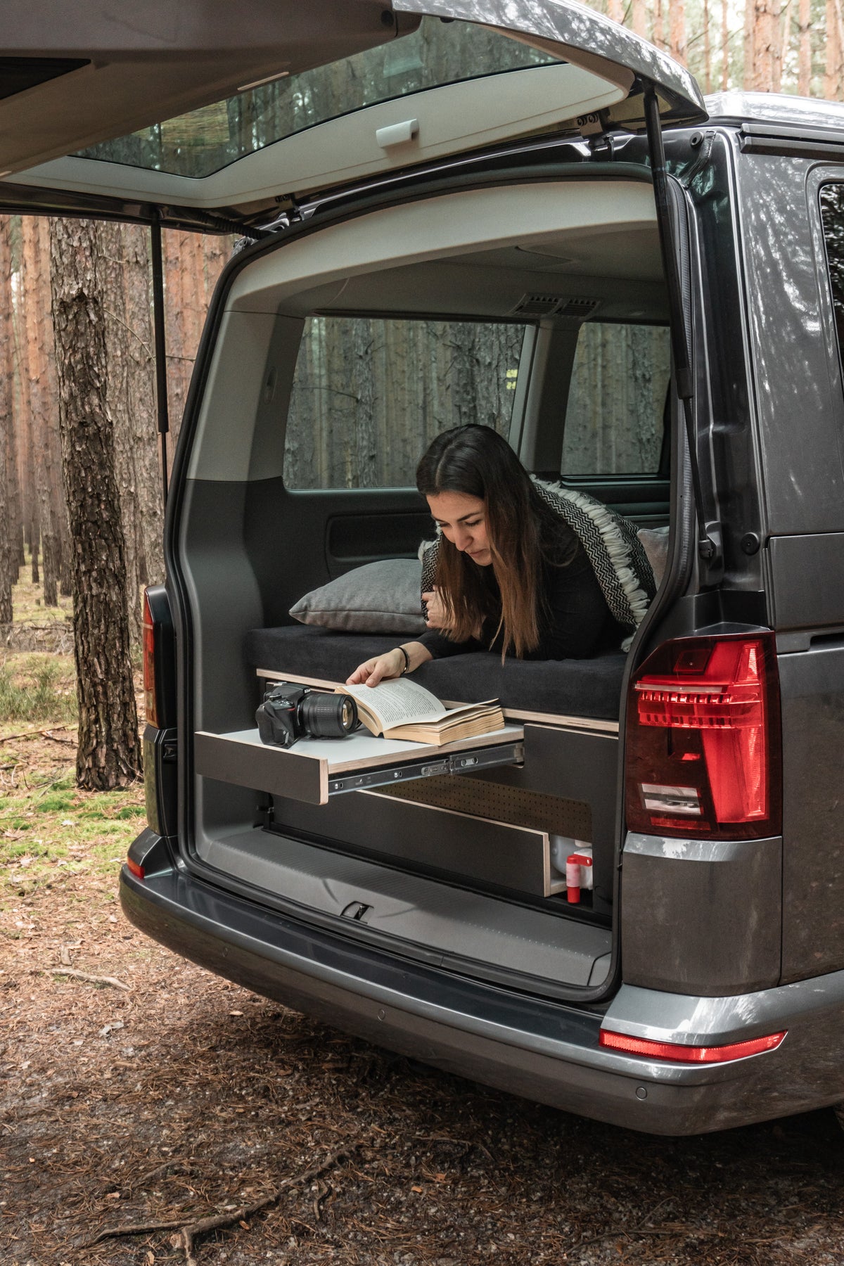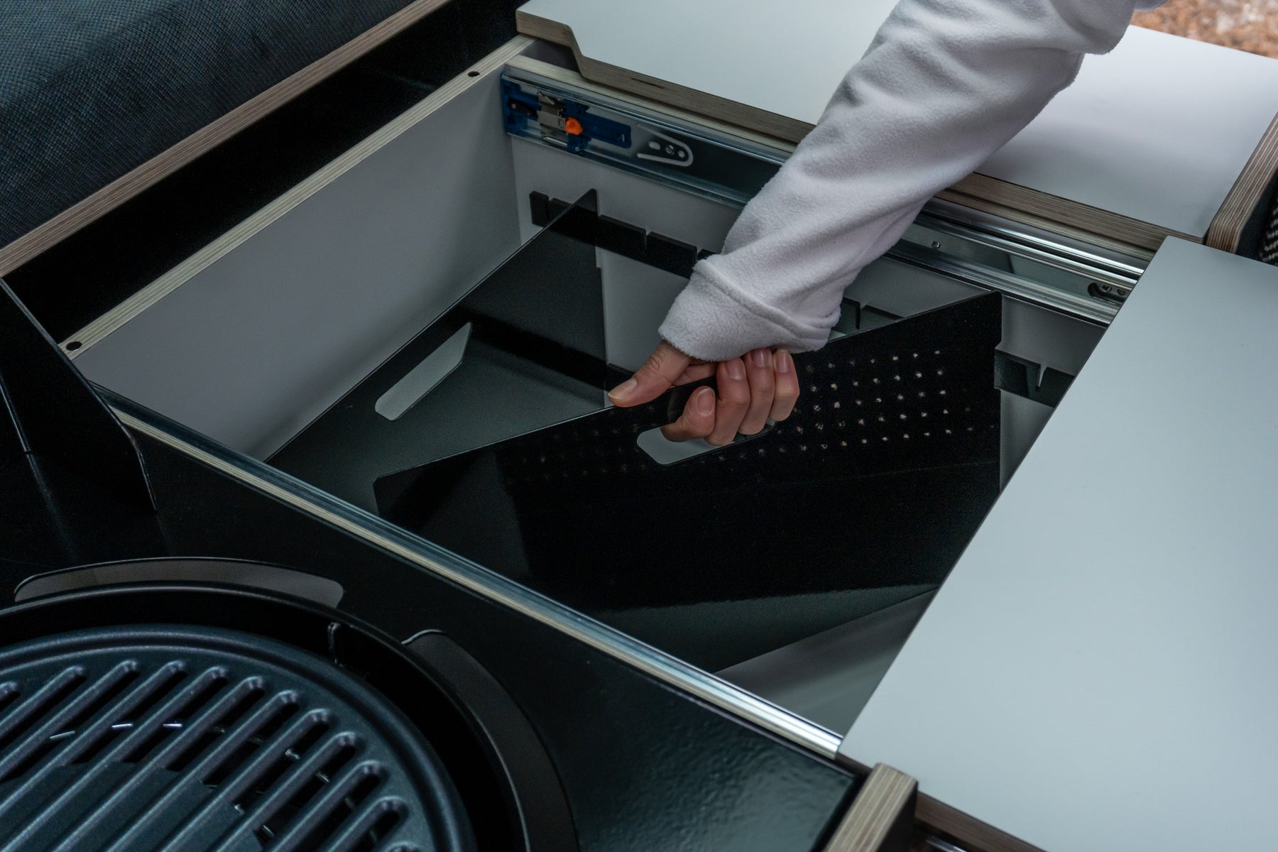Das All-in-One Modul mit riesigem Küchenauszug, herausnehmbarer Grill & Korb, Doppelbett, Sitz-Lounge, Großer Stauraum, 4 Taschen, 15L Wasserkanister, Lasergefertigt.