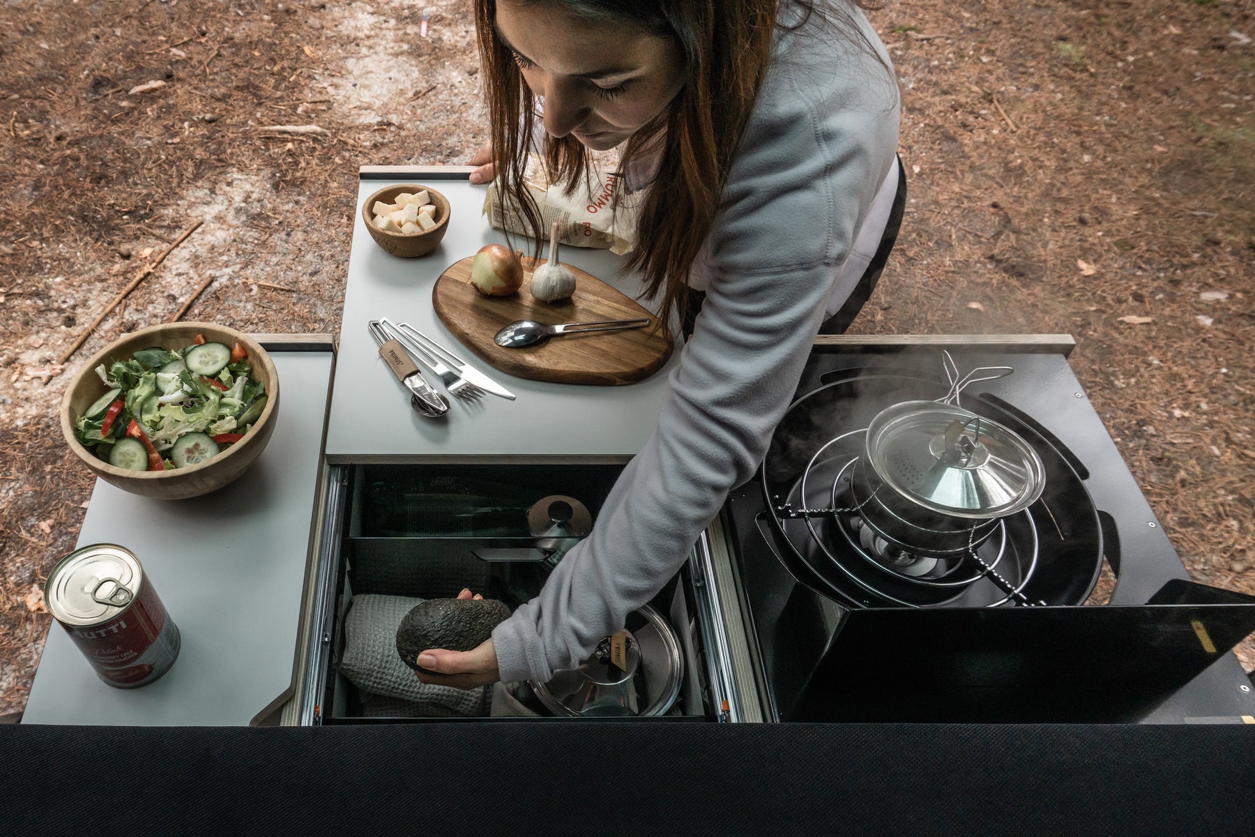 Gegrilltes Gemüse oder Toast? Heißer Kaffee am Morgen? Du sagst es, das Moie kann es. Sterne-Gastronomie im Kofferraum Deines Vans, oder wo immer Du möchtest. Mit dem entfernbaren Grill, der Stauraum-Box und dem Wasserkanister.