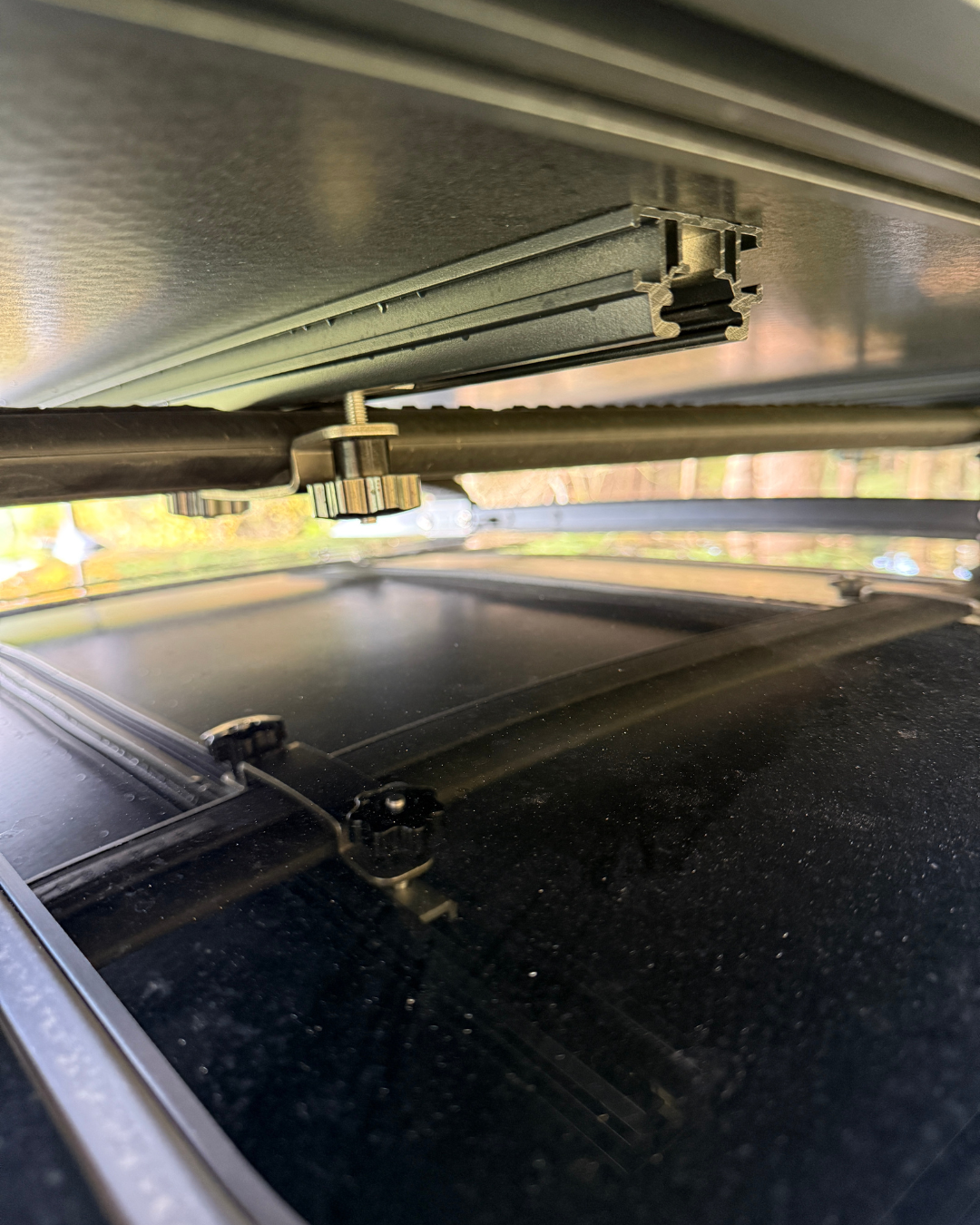 Durch das starke Aluminium Exoskelett ist das GEAR ROCK® Banff zusätzlich mit zwei Oberschalen Querträgern ausgestattet. Frei verstellbar in der Führungsschiene, bieten diese zusätzliche 30kg Lastaufnahme während der Fahrt.